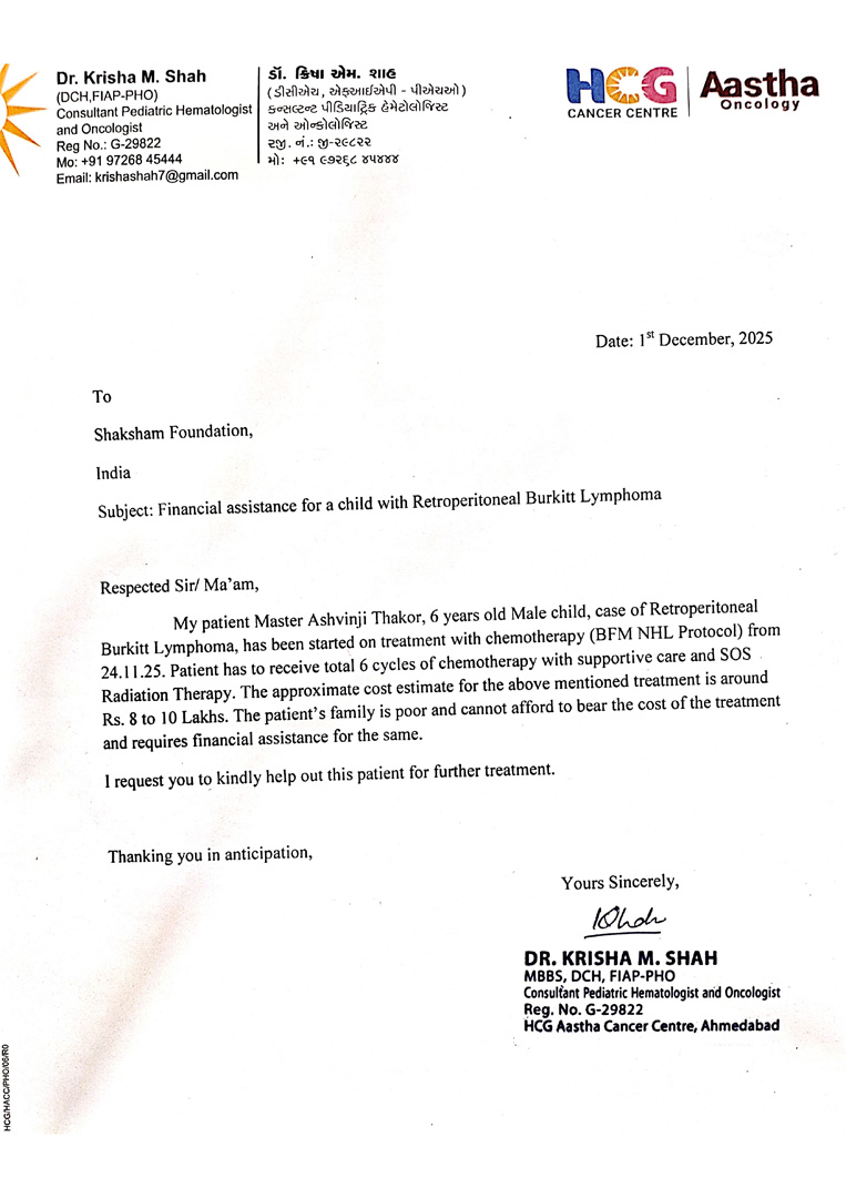 Master Ashvinji Thakor, a 6-year-old child, is currently undergoing medical treatment for a serious condition, Retroperitoneal Burkitt Lymphoma. He has been started on chemotherapy as per the BFM NHL Protocol, along with supportive care and radiation therapy as required.